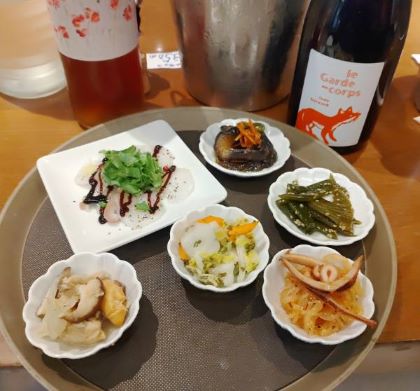 一部、差し替え等あり!右の1.プロセッコは、限りなくドライ!泡も十分!余市のペティアンは、アンセストラルが多いので、同一比較は出来ませんが、価格帯が同じなので、どちらを選択するかは迷うところ!きちんと造られたプロセッコの美味しさが楽しめます。2.の北海道ワインさんの懐かしきケルナー2009VT。今でも酸がきっちり有り、ホタテ卵巣?の味付けにピッタリ!お寿司にも好相性かも知れません!4.のロゼは流石この造り手。正確にはロゼではなく、オレンジワインです。少々のタンニンが具合良いです!そして、ボールナールのトゥルソー!ボルナールは、ナチュラルワインだから、優しく滑らかで旨みがある的に思うと、まったく別ものです!粘土質からのキメ細かなタンニンとボリューム、ミネラルが骨格を支え、滋味が広がる。この辺が穏やかと言えば、穏やか!10年は熟成させたい!ハイレベルな1本です!下の写真でいいますと、赤なのに、上記のような味わいなのにタコのカルパッチョ(バルサミコ)、小茄子のおひたしには、最高の相性です。素晴らしい幅の広さ、懐の広さです!
